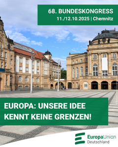 Am 11./12. Oktober tagt der 68. Bundeskongress der überparteilichen Europa-Union Deutschland e.V. auf dem Garagen-Campus in Chemnitz. Rund 160 Delegierte und Gäste kommen in die Europäische Kulturhauptstadt, um eine neue Verbandsspitze zu wählen und das 10-jährige Bestehen der Europa-Union Sachsen zu feiern. Schirmherr der Veranstaltung ist Ministerpräsident Michael Kretschmer.