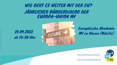Unter dem Titel: "Europa hat Zukunft - Wie weiter mit den Ergebnissen der Zukunftskonferenz der EU?" diskutieren die europapolitischen Sprecher*innen der Fraktionen der demokratischen Parteien im Landtag Mecklenburg-Vorpommern mit interessierten Bürgerinnen und Bürgern aus der Region.