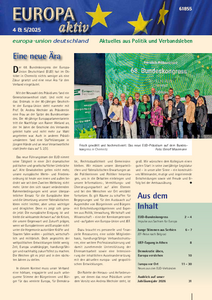 Die neue Doppelausgabe unseres Verbandsmagazins ist prall gefüllt mit guten Nachrichten aus unseren Verbänden. Der Bundeskongress hat mit Prof. Dr. Andrea Wechsler MdEP zum ersten Mal eine Frau an die Spitze der Europa-Union gewählt. Unsere Parlamentariergruppe im Bundestag konstituierte sich neu. EUD und JEF Sachsen feierten im Rahmen des Bundeskongresses in Chemnitz ihr 10jähriges Bestehen, die Kreisverbände Trier und Schwalm-Eder begingen kürzlich sogar ihr 75. Jubiläum. Tagesfahrten, Diskussionsrunden, Infostände, Schulprojekte: Lesen sie selbst, welche erfolgreichen Formate von unsren Ehrenamtlichen Land auf, Land ab auf die Beine gestellt wurden.