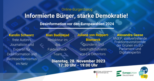 Tauchen Sie ein in den Online-Bürgerdialog "Informierte Bürger, starke Demokratie! Desinformation vor den Europawahlen 2024" am 28.11.2023 von 17:30 bis 19:00 Uhr. Gemeinsam mit Alexandra Geese, Karolin Schwarz, Kian Badrnejad und Juliane von Reppert-Bismarck werden wir uns kritisch mit dem Thema Desinformation in Europa auseinandersetzen, insbesondere im Kontext der bevorstehenden Europawahlen 2024.