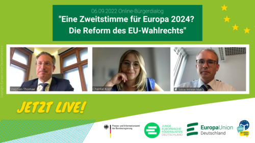 Bekommen alle EU-Bürgerinnen und -Bürger eine zweite Stimme bei der Europawahl 2024? Schalten Sie sich ein am 6. September und diskutieren Sie mit Chantal Kopf (Bündnis 90/Die Grünen), Stephan Thomae (FDP) und Tobias Winkler (CDU/CSU) bei unserem ersten Online-Bürgerdialog nach der Sommerpause.