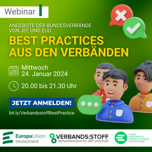 Die Europawahl rückt näher – Ehrenamtliche in ganz Deutschland stehen in den Startlöchern und bereiten Aktionen, Diskussionsveranstaltungen und weitere Aktivitäten vor. Zeit uns darüber auszutauschen! Am 24. Januar um 20 Uhr gibt es beim JEF-EUD verbands:stoff Webinar dazu Gelegenheit. EUD und JEF stellen Angebote, Materialien und Best Practices für Ehrenamtliche zur Europawahl-Kampagne EurHope vor.